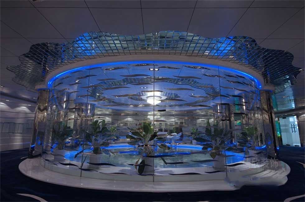 和圓形頂面對(duì)應(yīng)的中心展示區(qū),既有凸出重點(diǎn),又能體現(xiàn)出區(qū)域分隔的妙處,半透明玻璃的材質(zhì),可以起到一定的隱私性,同時(shí)從外面看起則是一副似魚兒在游動(dòng)夢幻般的場景。