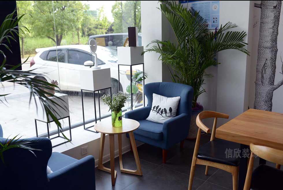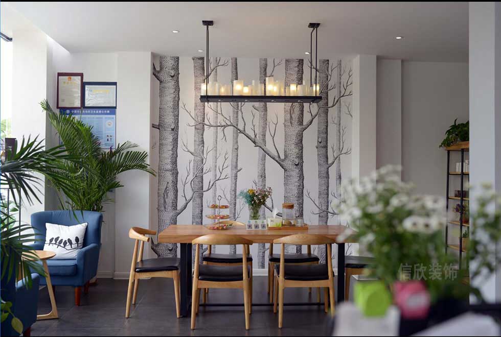 窗邊的洽談區,光線飽和度高,視野效果非常好,搭配北歐風元素的長條形宴會桌椅,白色枯樹壁紙和黑色手工藝的吊燈,讓客戶不論交談或休閑,都能感受來自異域的不同情調。