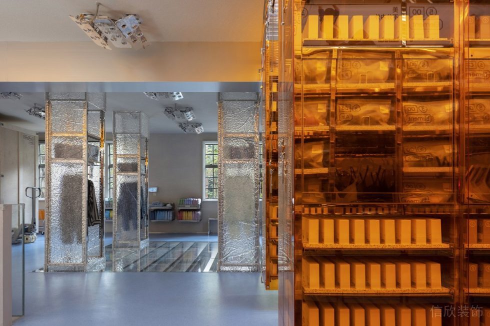 設計理念:本案是一所現代風的小眾睡衣襪子服裝店,位于老城區的街道邊上,客戶需要設計上具有時尚和潮流的前衛感,信欣裝飾公司的設計團隊根據客戶的要求,以現代風格入手通過別出心裁的設計和獨有元素,打造出小眾亮眼的設計感。入戶采用黑色的門頭,結合白色的拼接式LOGO,黑白的色彩搭配,結合幾何的圖形看上去醒目大氣,通明玻璃門的設置,讓店內更明亮更飽滿。頂面則更有石膏板和中間實木的板材豎式的格柵結合,再加上六根金屬鏤空式的鐵藝架子支撐,銀色的褶皺感的塑料布包邊,既可以當做展架展示貨品,也是一種創意感十足的設計元素。店里白色乳膠漆的墻面,環保,省錢讓光線亮度更好,灰色和藍色的地漆,讓地面顯得更有色彩的對比性。黃色亞克力玻璃的貨架,則增添了不同的元素,讓主題更充實。從而讓整個服裝店看起來,更有現代元素,小眾時尚的氣息,更有自然獨特的品牌元素,讓顧客更容易記住這家創意十足的店。
