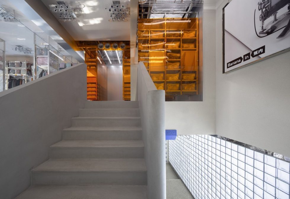 現代風服裝店裝修樓梯,旋轉式的灰色水泥樓梯,白色的小方塊磨砂玻璃墻面。