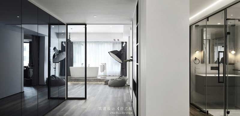 臥室看向攝影區(qū)視角。整體空間互通,使用雙開門的推拉門。