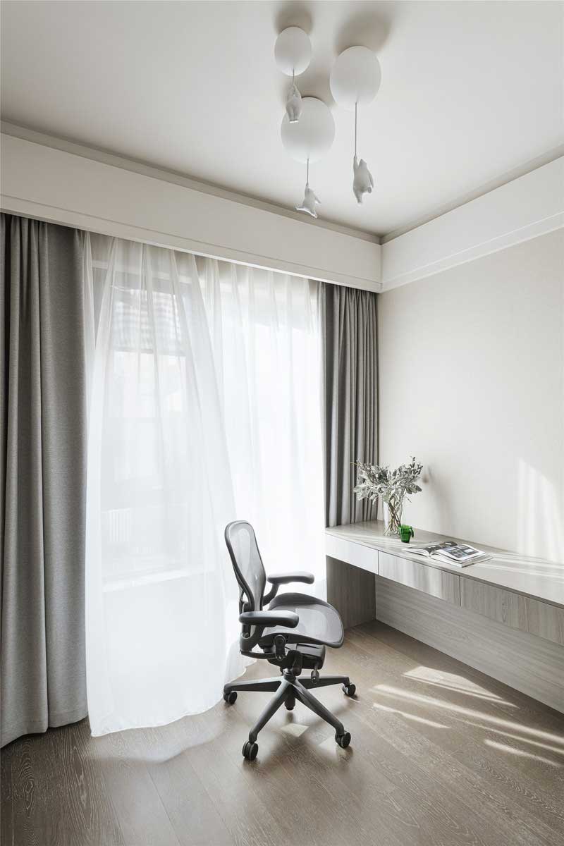 書房保持了簡潔的氣質,深色木質地板帶來的沉穩感迎合著業主平時在此思考、工作的安靜氛圍,良好的采光性保證了室內光源充足,讓空間內營造出與自然相通的流暢感。