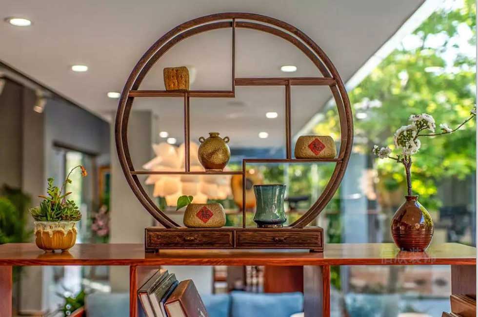轉(zhuǎn)角處作為會客區(qū),和玻璃的隔間做了一個承接,開放式的空間,寬敞而不顯得壓抑,實木仿古的置物架和吊燈,既是洽談和休閑功能區(qū),也是一種中式風(fēng)情的的室內(nèi)展示景觀。