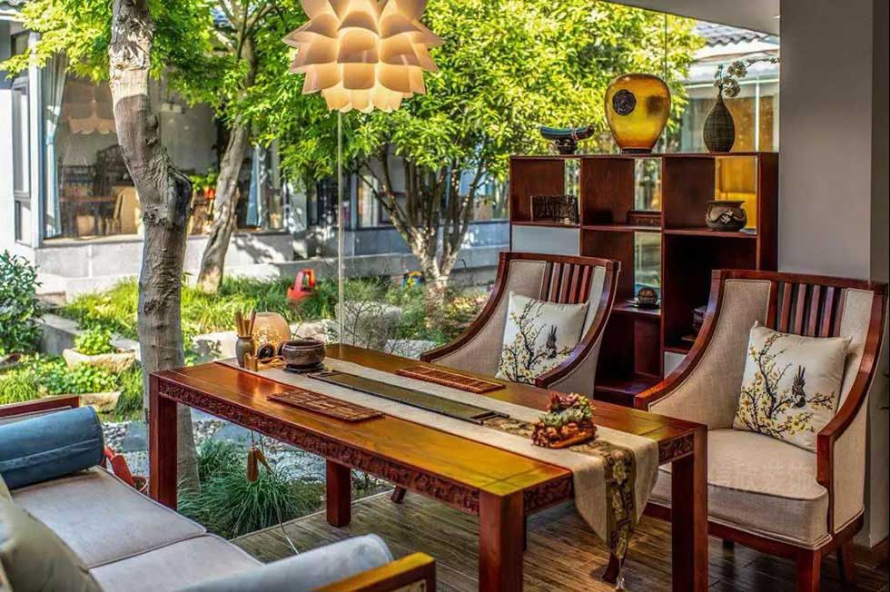 灰色的水泥地磚,白色的墻和頂簡單處理,更有歲月侵蝕的恒基,配上實木的長桌和竹椅,望著窗外通透明亮的庭院,把實木裝飾的韻味發(fā)揮的淋漓盡致。