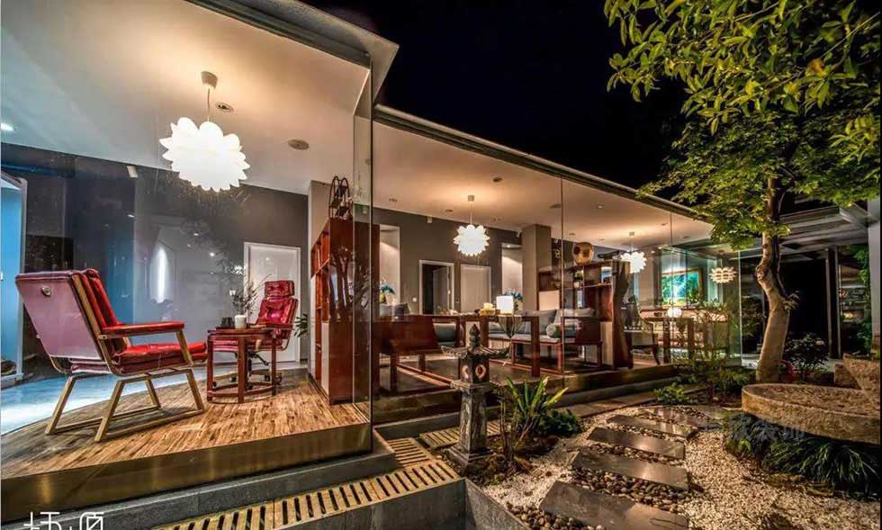 開放式的玻璃房間,取代傳統(tǒng)的隔墻,夜間在光影的照耀下,又有另一番區(qū)別于白天的景致,中式的庭院在夜色的籠罩下,古色古香的味道似乎在述說著遙遠的故事。