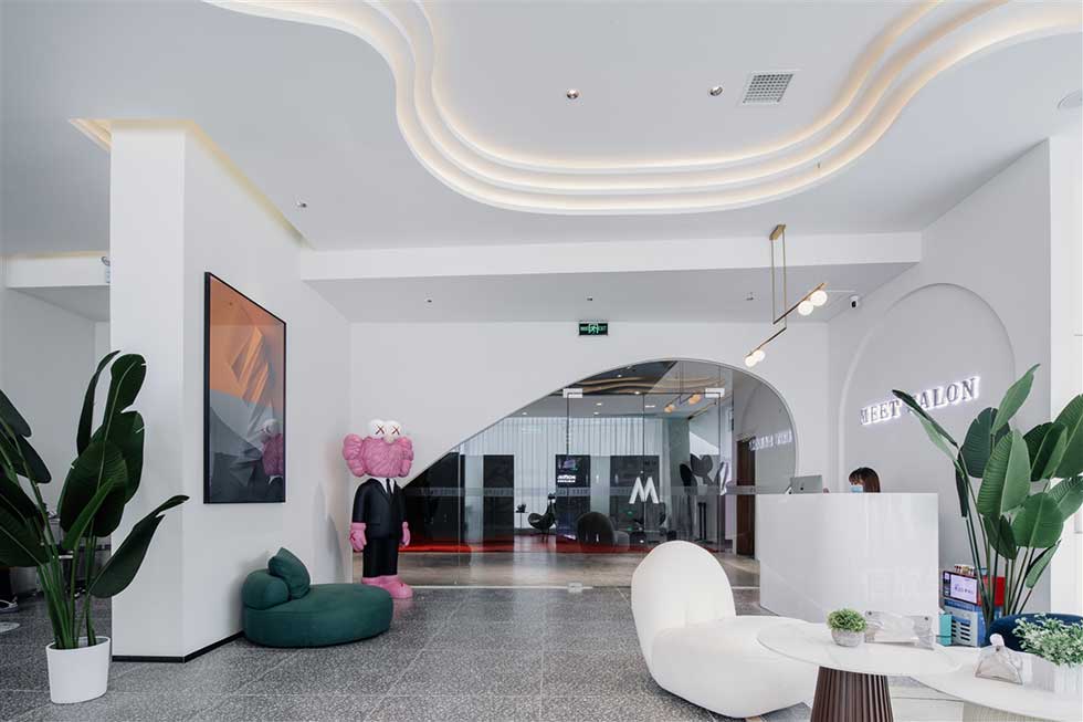 圓弧形的背景,和半圓弧門洞,花瓣頂面相呼應(yīng),既能體現(xiàn)整個(gè)空間的協(xié)調(diào)性和統(tǒng)一性,又顯簡潔耐看,立體式的前臺(tái),線條感流暢,層次分明而立體感強(qiáng)烈。