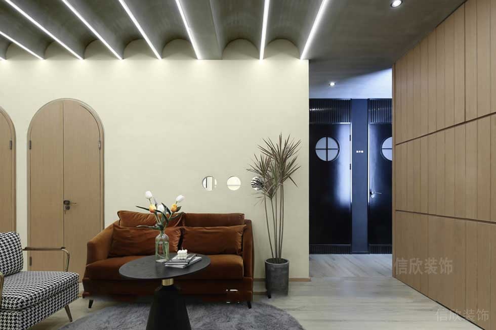 拱形吊頂與水泥色的組合,多了一點溫柔;搭配上條形燈光,空間上更具躍動感與層次感。