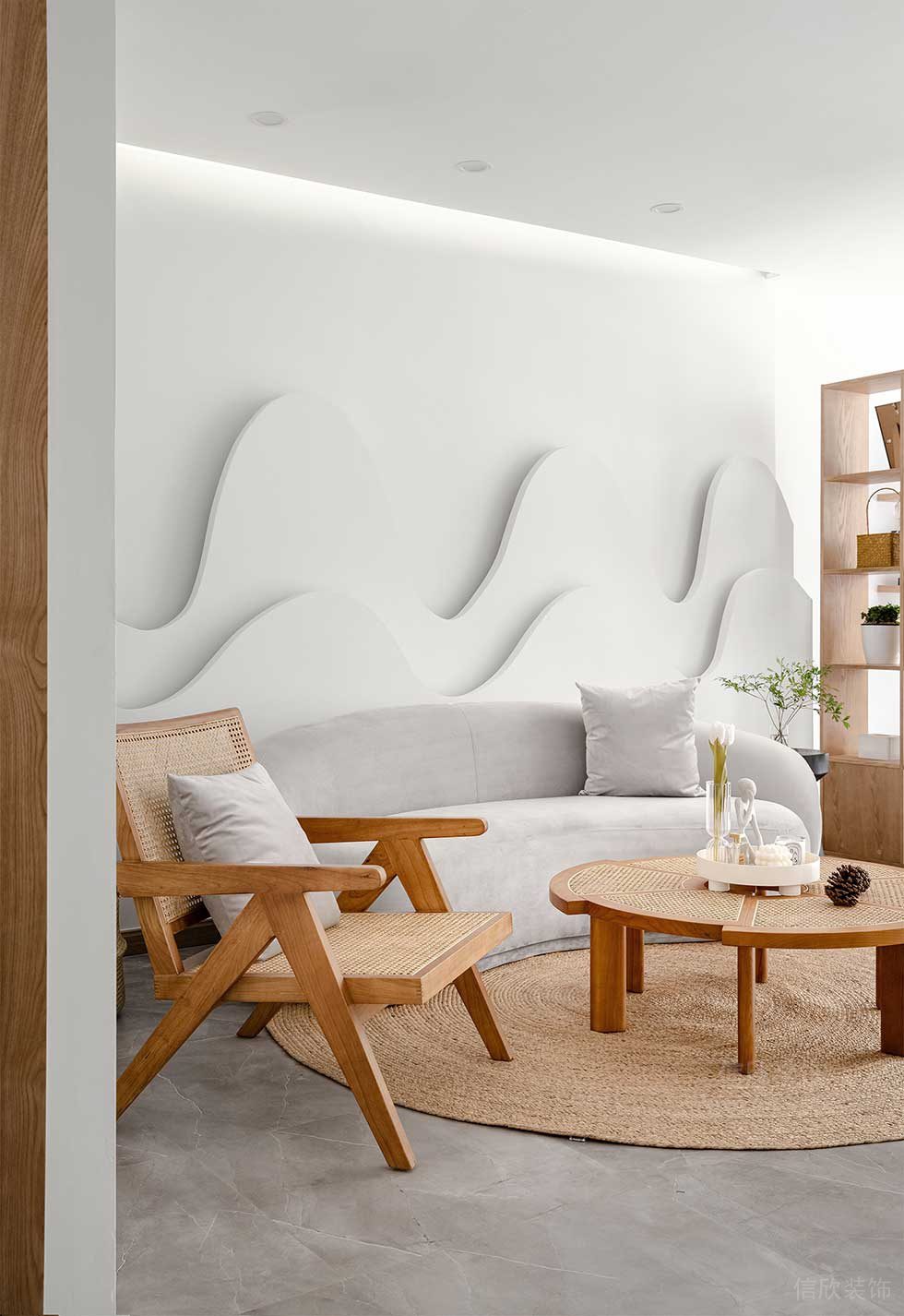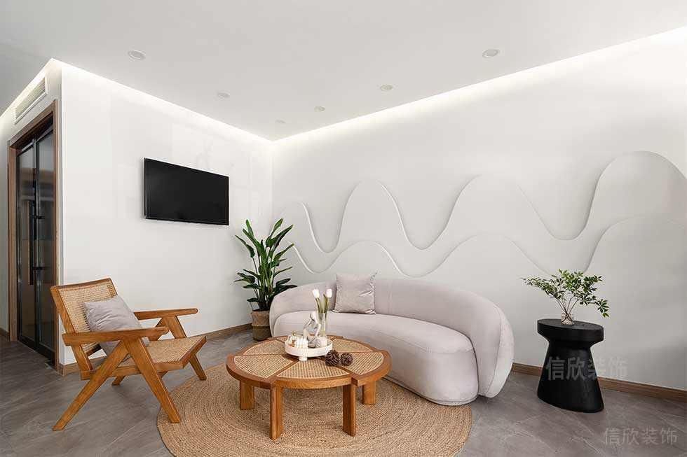 整體白色的效果,外擴式的燈條,帶動整個空間的氣息,看起來靈動活躍而不顯得呆板,白色石膏板的波浪紋背景墻,依山傍水的休閑方式,盡享精致生活的情調(diào)。