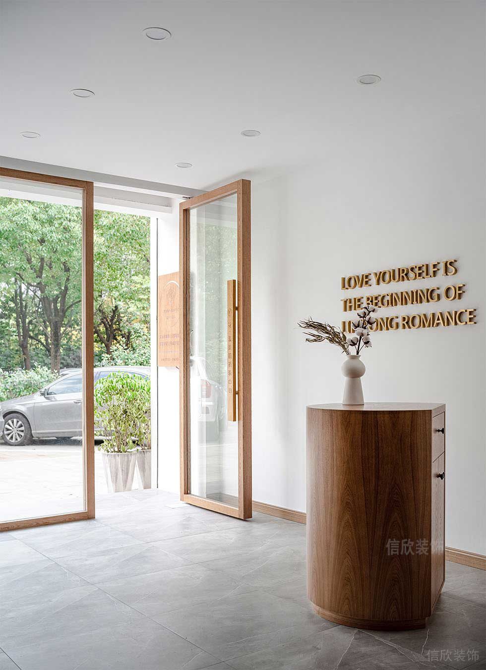 前臺的裝修設(shè)計,白色的墻面和灰色大理石紋理的地磚應(yīng)用,落地式的玻璃門窗,整個空間光線飽和度高,明亮開闊,原木風(fēng)紋理的前臺,體現(xiàn)出至簡,樸素的生活方式。