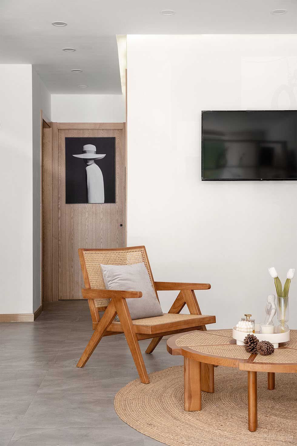 原建筑結(jié)構(gòu)做一個簡單的刮白處理,搭配原木風(fēng)的木地板,開發(fā)商落地窗的設(shè)計,用大面積光線引入當(dāng)做設(shè)計的一部分,使空間看起來開闊透亮,而不會顯得擁擠狹小。