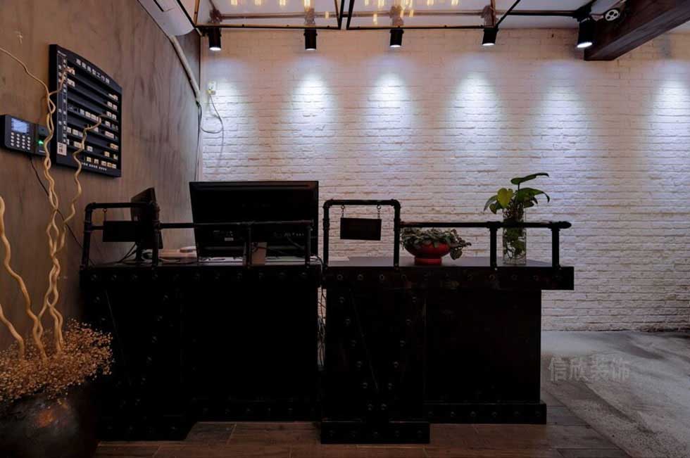 白色的文化石背景墻,點綴出粗獷的文藝氣息,黑色實木帶金屬圓釘的前臺,鐵藝的手工黑色吊頂,在黑白兩種色調的對撞下,給人一種古老而神秘的既視感。
