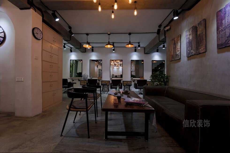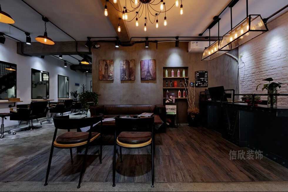 設計理念:本案是一所工業風的美發沙龍裝修設計案例,工業風在墻面與地面的裝飾上一般都會選擇裸露的磚塊,或者在磚塊上粉刷黑色、白色或是灰色作料,粗糙的質地、斑駁的機理效果都會表現出一種舊舊的卻又非常時尚粗獷的視覺效果。水泥墻或者水泥地面是工業風格裝修的經典元素之一,水泥墻面泛著冷靜的光澤看似冷漠卻又非常具有現代感。墻面有時會用涂鴉的裝飾方式表達它的特別之處。頂面水泥頂面會保持原有色彩或者涂刷成黑色,原始的水電管道排布其下,或隱秘或在燈光的照射下偶爾閃現出一道金屬光,神秘感覺十足。