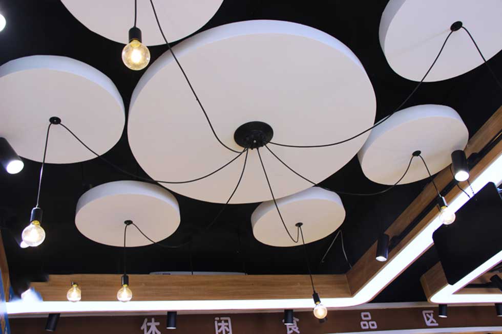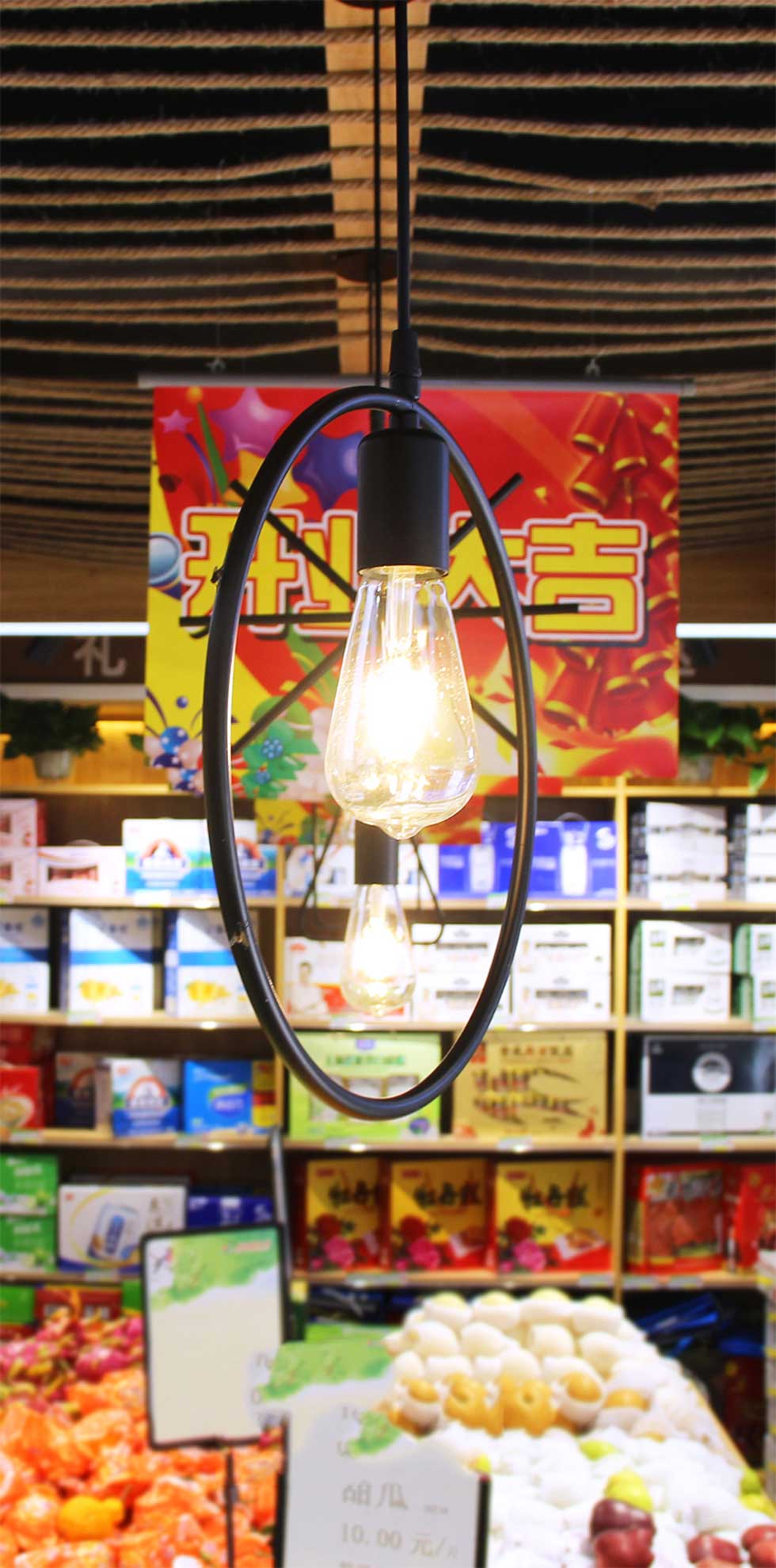 正方形的圓形燈眉讓中島臺的空間,設計感和線條感更強烈,里面大小不一的圓形設計,工業(yè)風的鐵藝吊燈,使光線的飽和度提高,光影折射充足,讓水果在中島臺上顯得更漂亮。