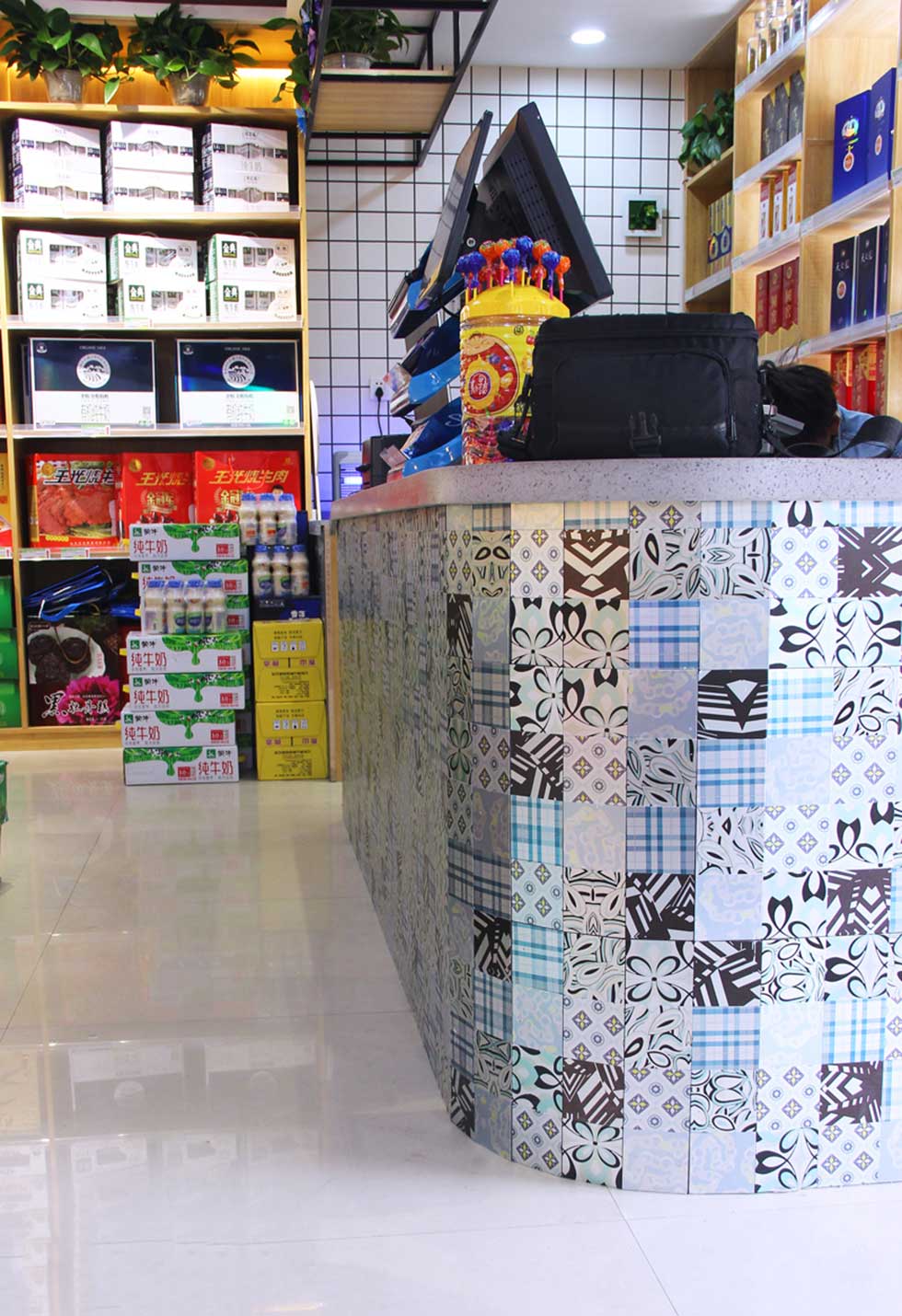 原木結構的壁柜和中島臺的設計,使空間的整體不浪費,在商品的品種上可以多一些選擇,多上一些樣品,在光線的照射下,溫暖而甜蜜,色彩感覺如陽光一樣的溫和柔情。
