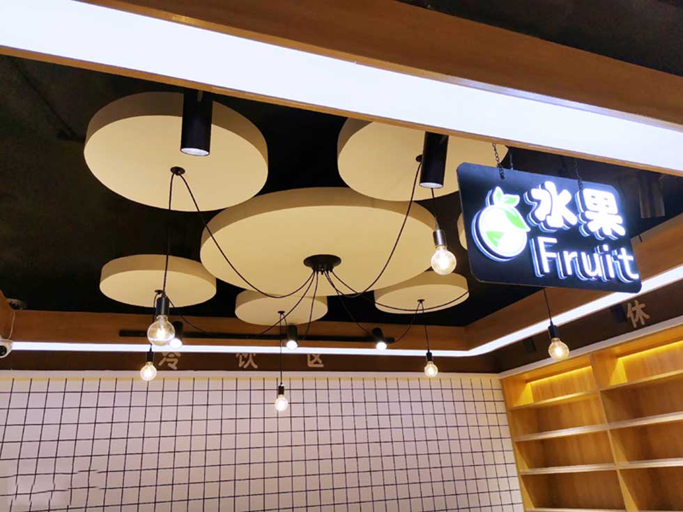 水果店頂面的裝修,保留了原始的結構,用噴黑的處理方式,入戶利用燈眉降低了層高,給人感覺藝術飽滿而不顯得空曠,麻繩組成的格柵頂面,新穎大膽,充滿手工藝術的氣閥。