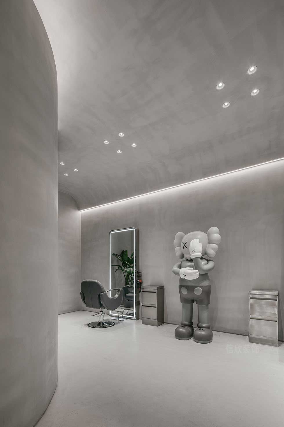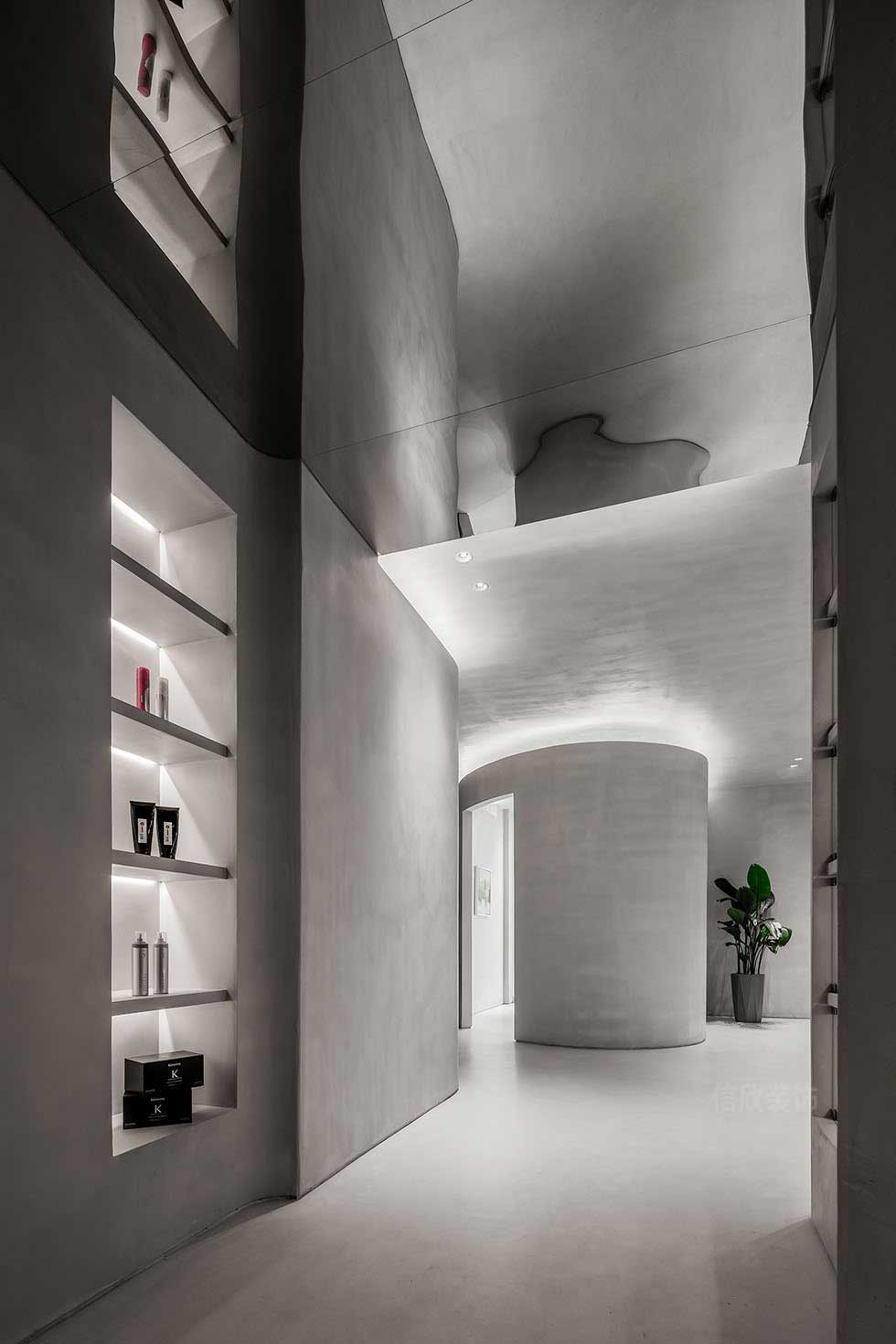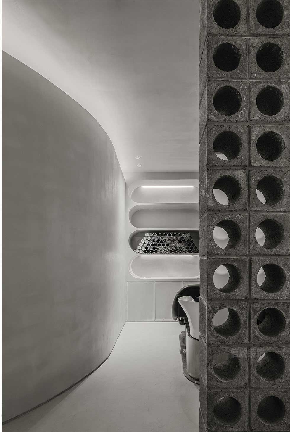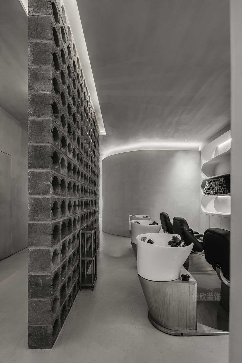 通過(guò)對(duì)“形”與“色”的對(duì)比、交疊、碰撞、拼接、組合,找到了微妙的平衡感,也賦予了空間無(wú)窮的可能性。設(shè)計(jì)將細(xì)膩的水流與光影變化納入其中,分隔精細(xì)的收納架讓美發(fā)、護(hù)發(fā)的產(chǎn)品有了便捷清晰的收納,同時(shí)裝點(diǎn)了空間。