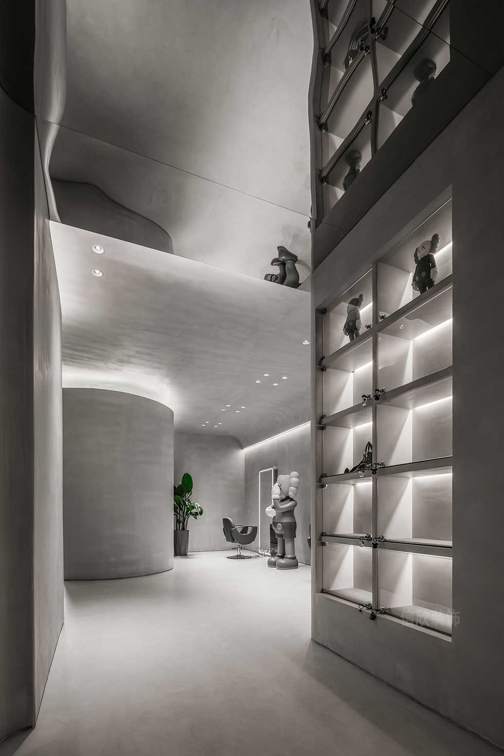 精神性可以被具象或抽象地表達(dá),設(shè)計(jì)師在有限的空間內(nèi)尋找屬于空間本身的最簡(jiǎn)潔有力的語(yǔ)言。區(qū)別于市中心的喧鬧,空間靜靜將人引入脫離平庸的新銳世界,遵循了獨(dú)特的質(zhì)感邏輯,隨物賦形,創(chuàng)新與融合空間造型。
