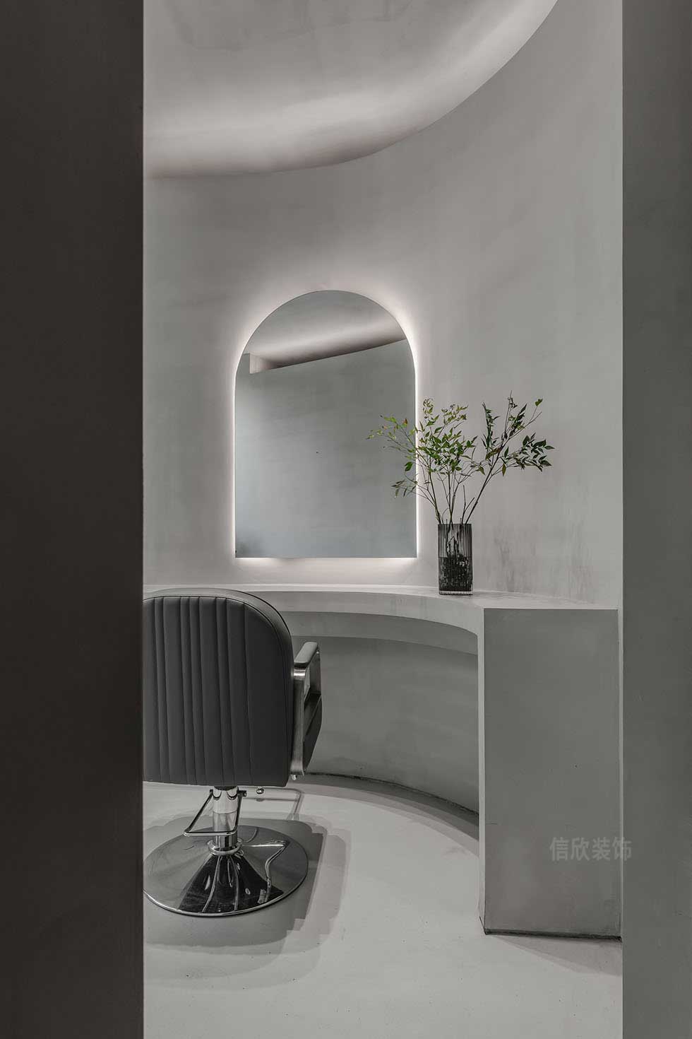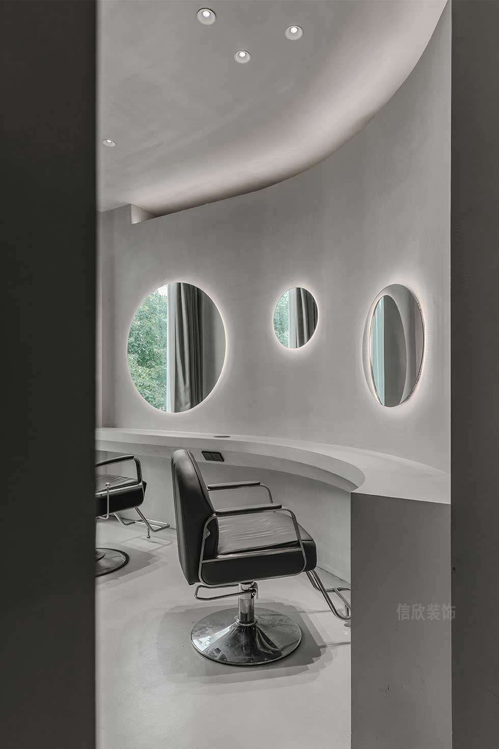 設(shè)計(jì)再次展現(xiàn)了自然與室內(nèi)的無(wú)邊之界,漫長(zhǎng)的造型時(shí)間難免枯燥無(wú)聊,巧妙的設(shè)計(jì)恰好可以為時(shí)光增添生趣。弧線形的操作臺(tái)讓每位客人都暢通無(wú)阻地欣賞到戶外風(fēng)景。在等待的間隙給眼睛放個(gè)假,也為心靈安排了一段愜意的旅行。