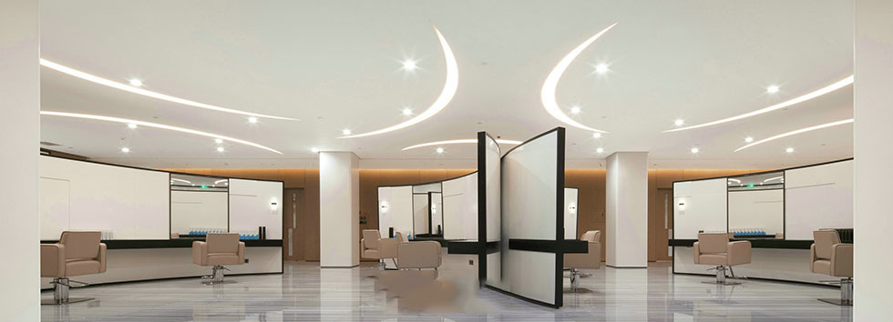 四層的護(hù)墻板,看上去層次感非常強(qiáng),通過燈光的打磨,檔次得到提升,LED顯示屏的背景墻,不僅走在時代前沿,同時兼具科技感和營銷的作用,步入美發(fā)廳就可以看到企業(yè)文化的宣傳。