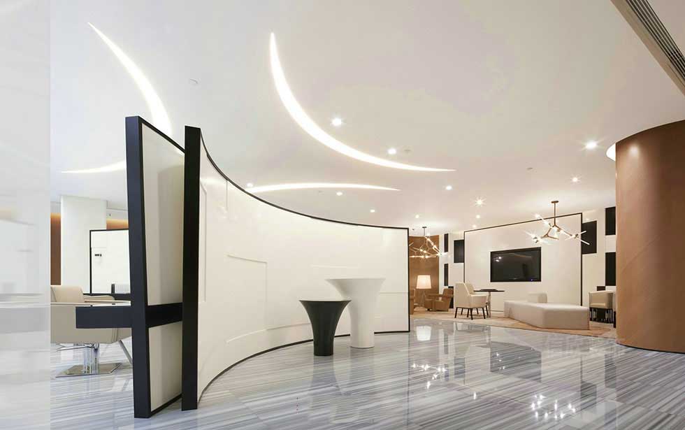 優(yōu)雅的弧線形,充滿了靈動性,設(shè)計師將弧線有層次的融入到整個空間中,線形的黑白石材,摩登時尚,大幅的影像,引領(lǐng)時尚的前沿。