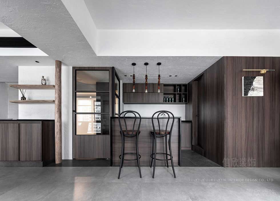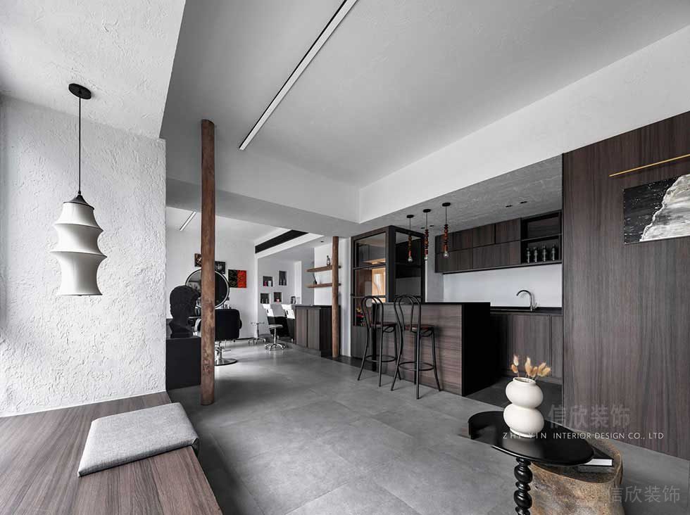 前臺作為小吧臺的形式,深色木紋的肌理效果,藝術內涵和文青氣息爆棚,同時給人一種高端的灰色的私密性,取代了傳統門庭若市感覺,增加了客戶自我肯定和特殊性。