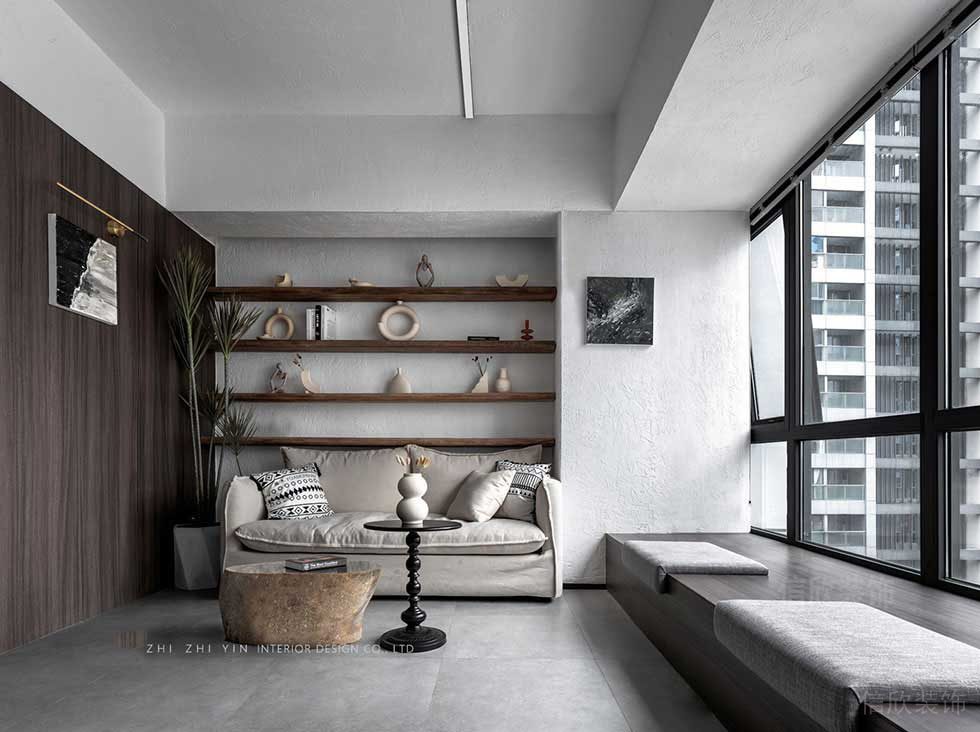 依窗而建的小洽談區,置物板的北歐元素和布藝沙發,光線明媚充足,通過顏色對比的方式,由淺而深的逐層遞進,使空間的色彩應用更富有層次感。
