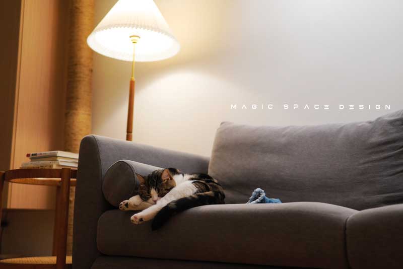 深圳羅湖北歐風格家居裝修設計客廳茶幾貓主子在沙發上躺著,由晝入夜,伽羅落地燈的百褶造型射出柔和的光,白天或者晚上在這里看看書喝杯茶,都有不一樣的體驗。