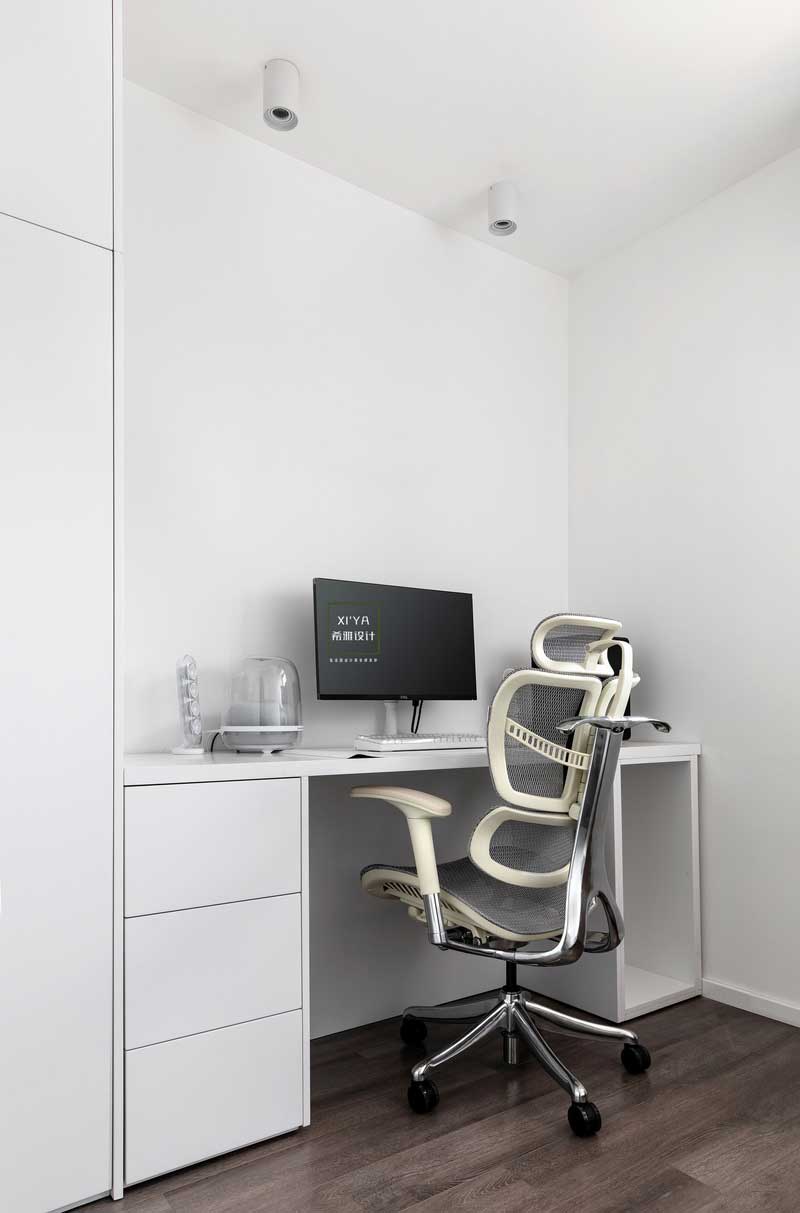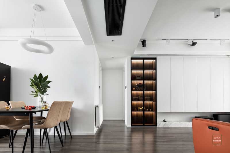 客廳的設計,以干凈清爽的純白色調為主體,雙眼皮的吊頂,著重區分了客廳的空間區域分隔型,無主燈的設計,工業感的軌道射燈,直射式的投影儀,在強調了功能性的同時,讓整體充滿了現代感和使用的功能性。