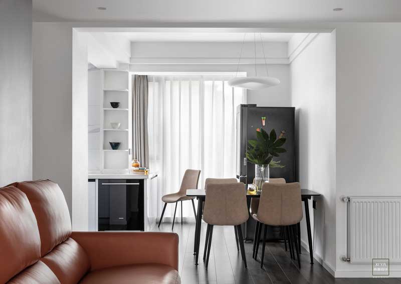 餐廳的設計,用黑色原木紋理的餐桌,搭配白色的墻面,黑白的經典搭配中,插入杏黃色的布藝椅子,給人一種復古的時代感,圓形不規則的吊頂,生動而形象。