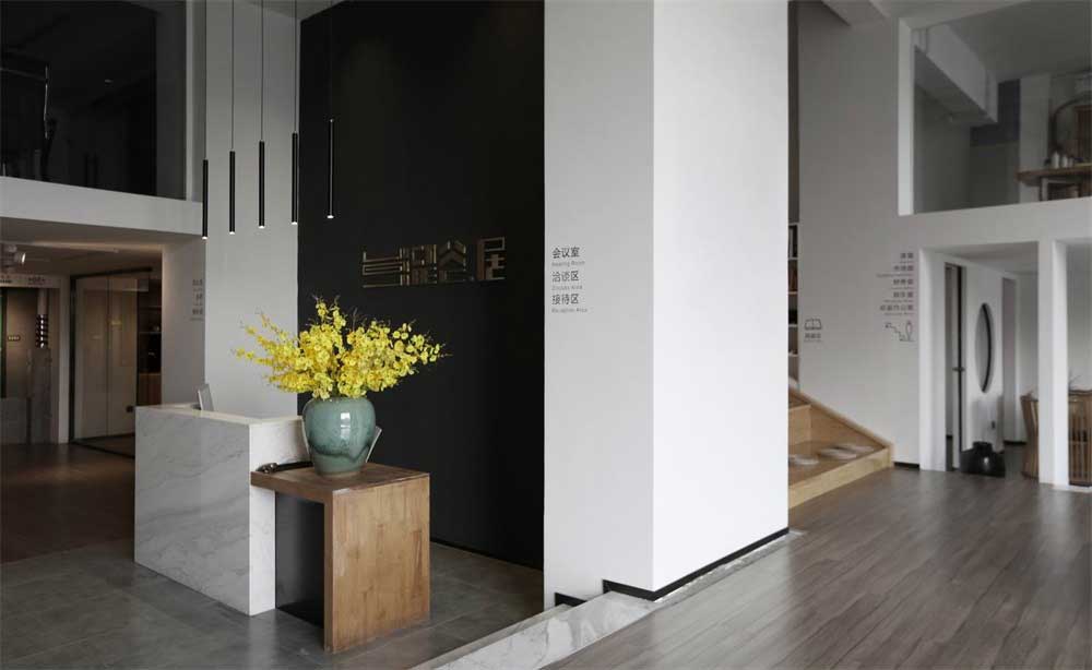 新中式辦公室前臺的設(shè)計,灰色大理石地面,黑色硬包背景墻,搭配延伸出島臺的前臺,優(yōu)雅而富有美感。