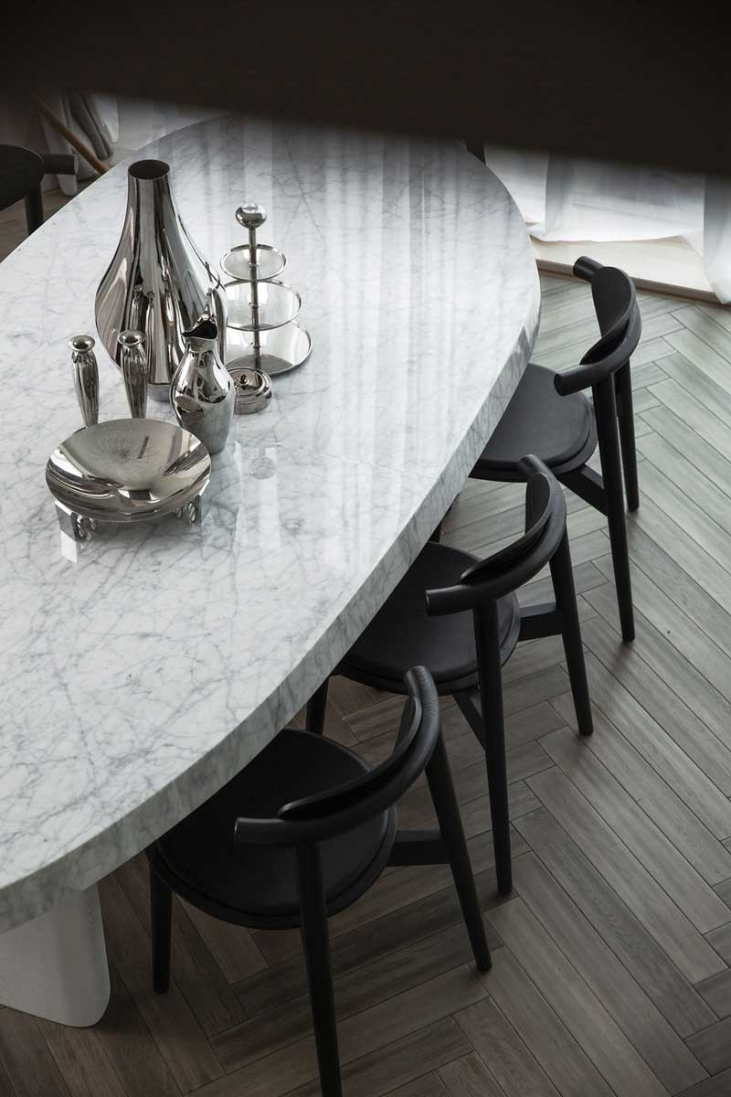 沙發后面留有空間作餐廳的位置,胡桃木的魚骨拼圖地面,搭配橢圓形天然大理石的餐桌,黑色斜角的椅子,黑白分明的經典搭配,極具藝術感的造型設計,靈動多變,造型唯美。