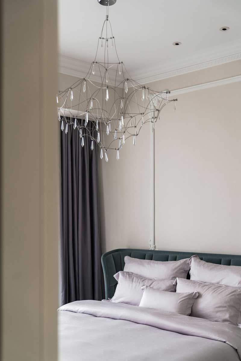 淺黃色的墻面漆處理,歐式石膏線條的裝點,以及歐式天鵝絨的枕頭的棉被,讓主臥帶有一種簡歐式的設計理念,內斂二不張揚,但仍然有一絲遮掩不住的歐洲貴族般的生活情調。