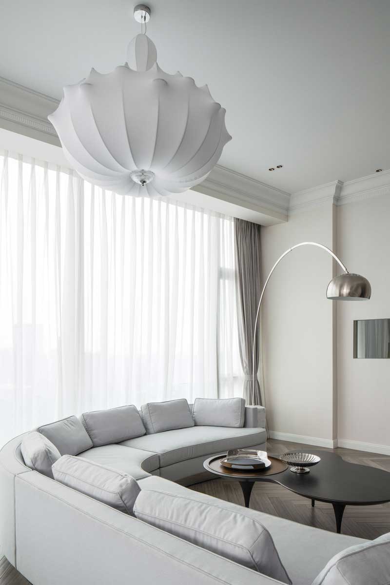 淺色調的客廳裝修,落地窗的設計保證光線的飽和度高,光線可以充分的引入室內,無頂式的結構,以石膏線條來增加層次感,半圓弧的沙發,曲線感非常強,符合現代簡約審美感。