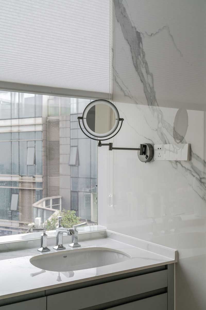 衛生間用L型的角度設計,隔出淋浴間的位置,和墻體幾乎達到了無縫銜接,把缺陷變成了功能性空間,保證了美觀和干濕分離,白色大理石瓷磚的應用,則保證了衛生間的亮度。