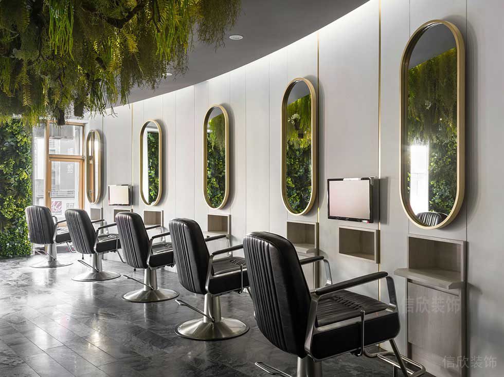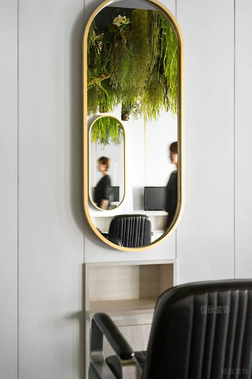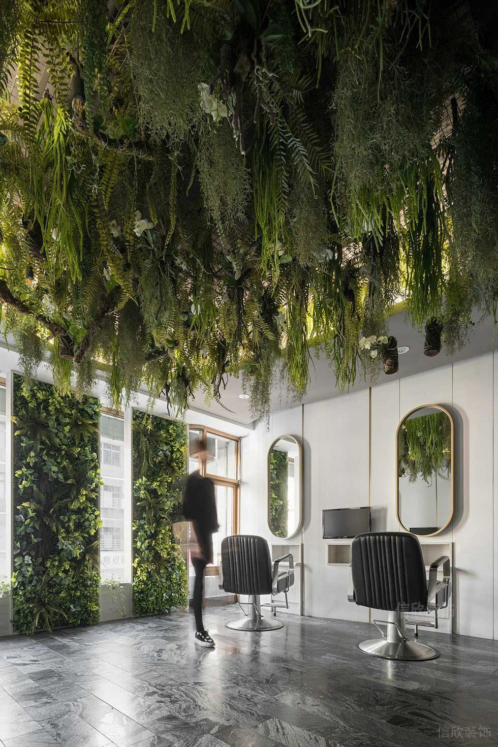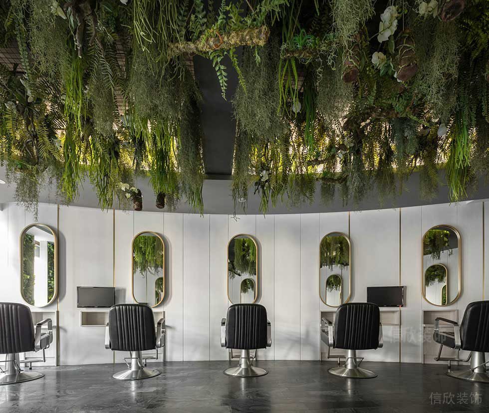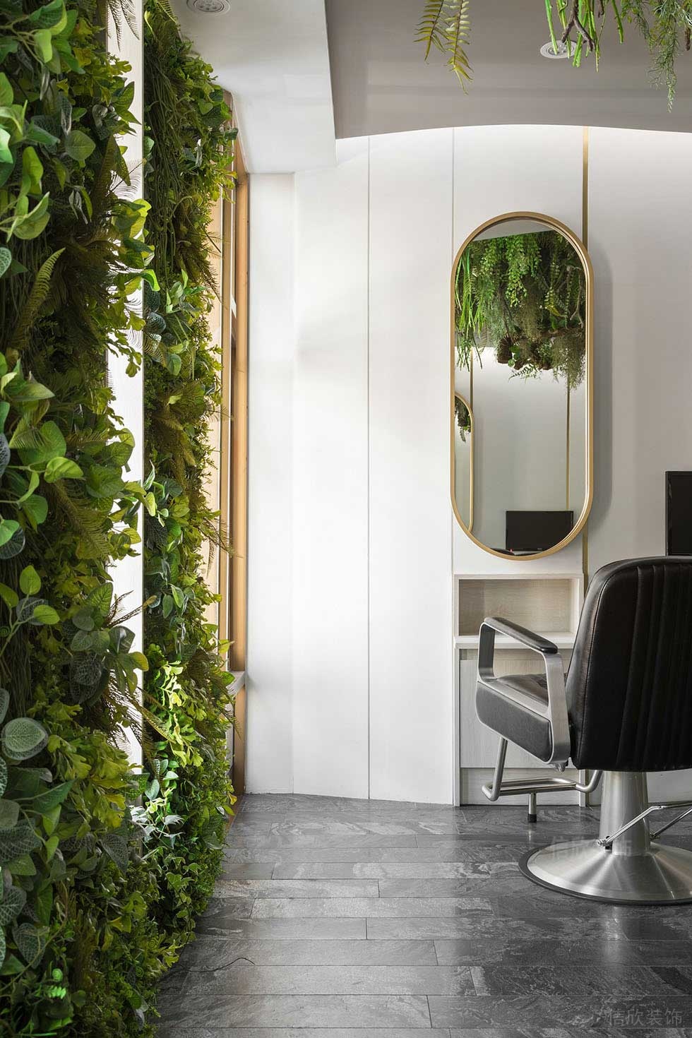 造型區(qū)的設計,采用直通式 的處理手法,頂部是下垂的綠植,給人的感覺比較自然和清新,而在一個個金屬邊框小鏡面的反射下,空間的立體感又能得到很好的提升效果。