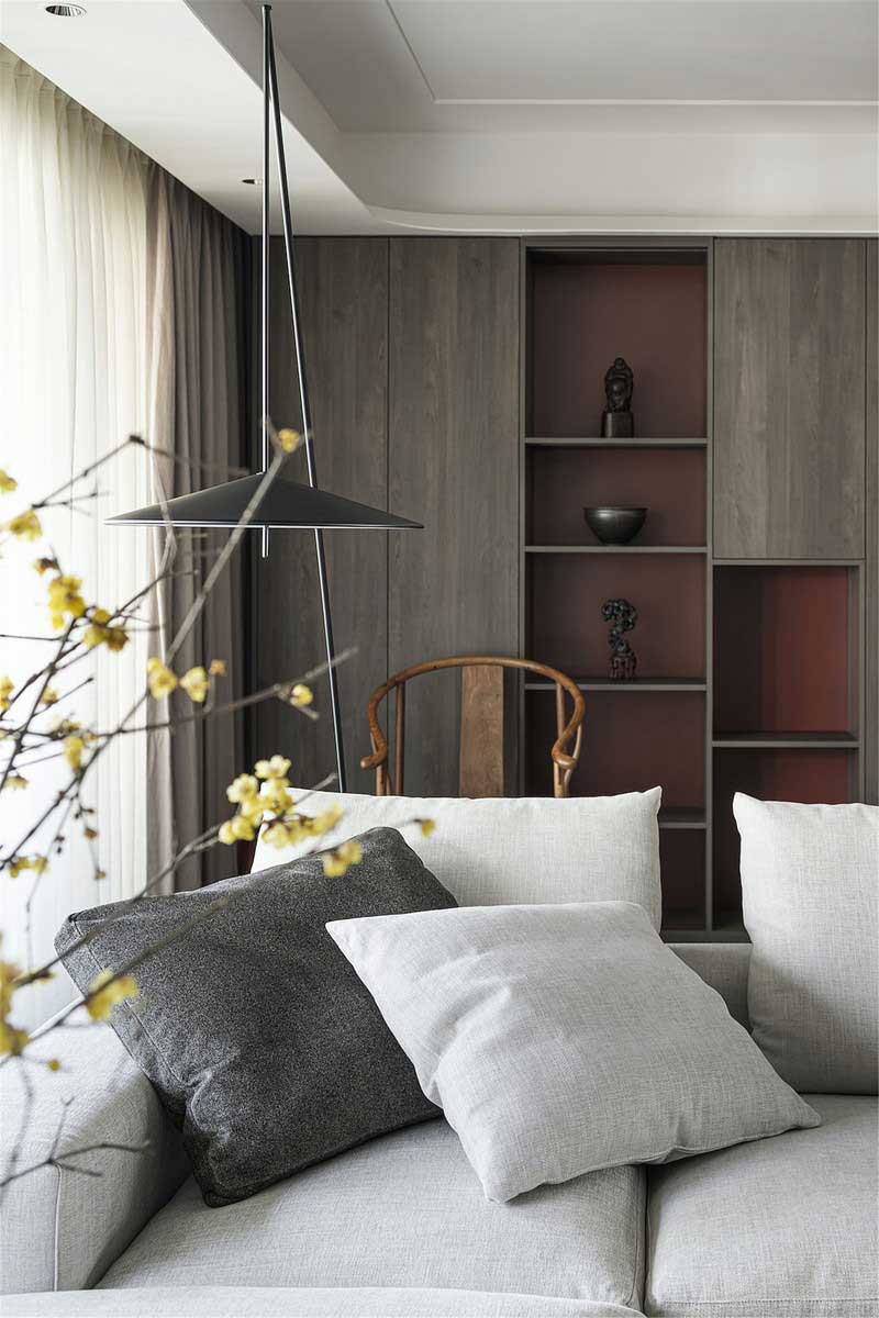 根雕的茶幾,古色古香的風貌。灰色布藝沙發,既百搭又能讓人更好的休息的放松,屏風式的隔斷,留出一小塊佛堂的空間,既做了空間的使用性分隔,也保證私密性。