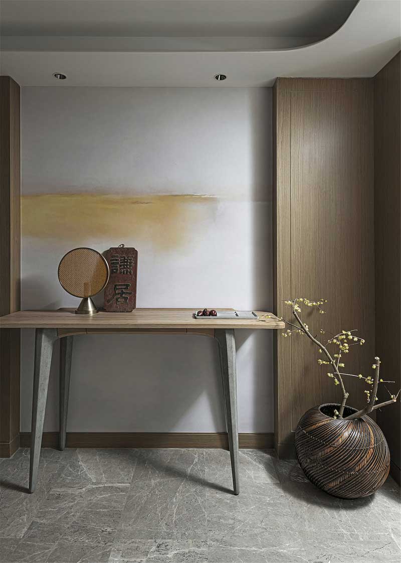 古典韻味的玄關柜,古樸而典雅,墻面的處理做出來,一副夕陽無限好的山水畫,搭配玄關柜有一種詩情畫意,旁邊一束冷梅乍出的畫面,情感細膩,意境深沉。