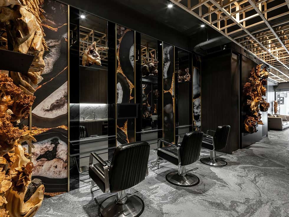 洗頭區和造型區放在同一片區域,可以使整體看起來更完整和和諧,同時相互又不會干擾,在金色和黑色兩者色調的搭配下,簡單中也能體現出潮流和設計感的完美組合效果。