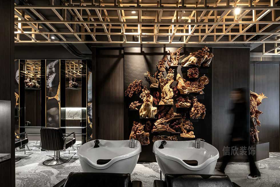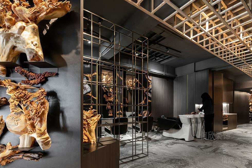 設計理念:本案是一所創意型風格的高端美容美發店裝修設計案例,美容美發店入戶的裝修設計,采用極具創意的根雕藝術作為背景墻,斜角的處理方式起到了隔斷的作用,也能使整個入戶區空間感更開闊,有效的區分了造型區和外立面大廳。以創意為主,沒有拘束,造型上追求簡潔,材料簡單,突出個性特征。在造型上,能夠獨一無二。一般來說,設計師會用幾何圖案,作為塑造整體的設計元素。適合藝術、工藝品、品牌公司。造型簡潔,用料簡單,強調原創的特征,盡量不重復,在造型上具有唯一性。