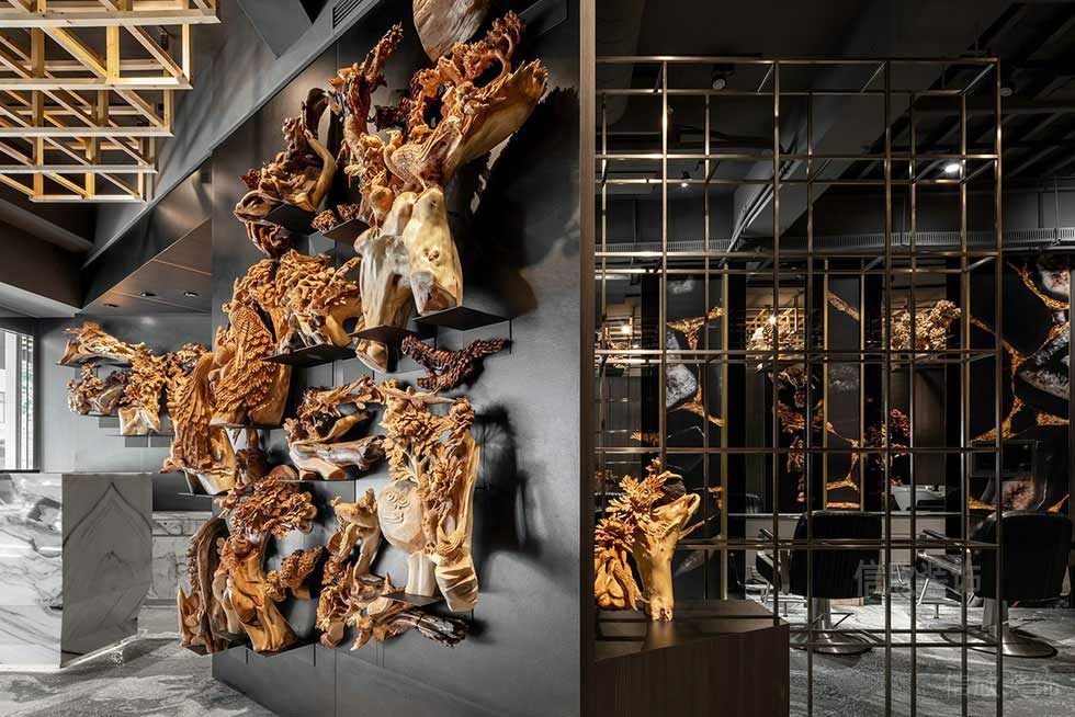前臺的設計,選擇和背景墻相同的深色原木背景墻和根雕的結合,看起來人文氣息和藝術感強烈,天然石材紋理的前臺,玻璃馬賽克的地面,形成了一副天然的水墨畫的畫風。
