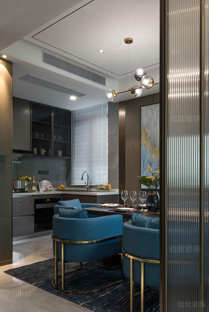 開放式廚房的設計,符合現(xiàn)代開闊大氣的理念,同時空間顯得寬敞而不局限,深色的餐桌,線條優(yōu)美的藍色餐椅,讓整個餐廳立馬變的活潑起來,并且?guī)в袣W式貴族范的優(yōu)雅品質(zhì)。