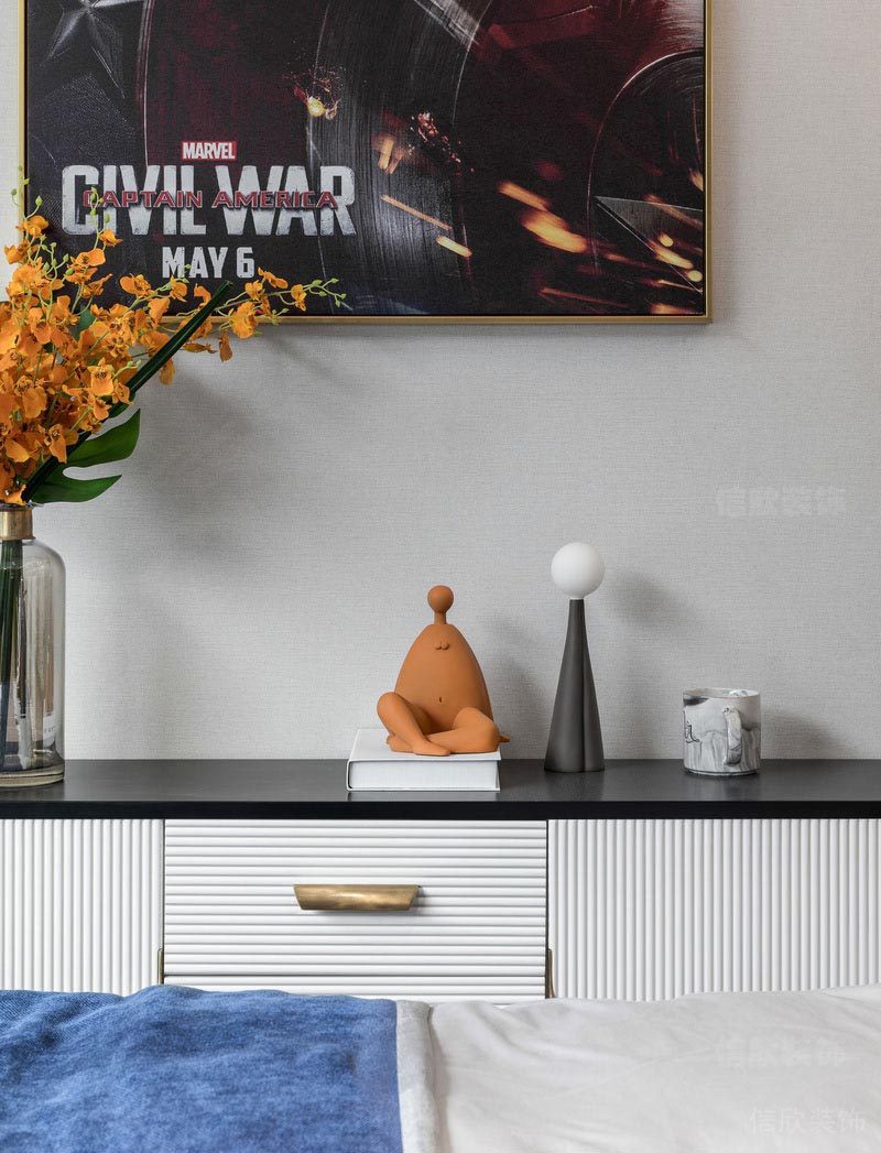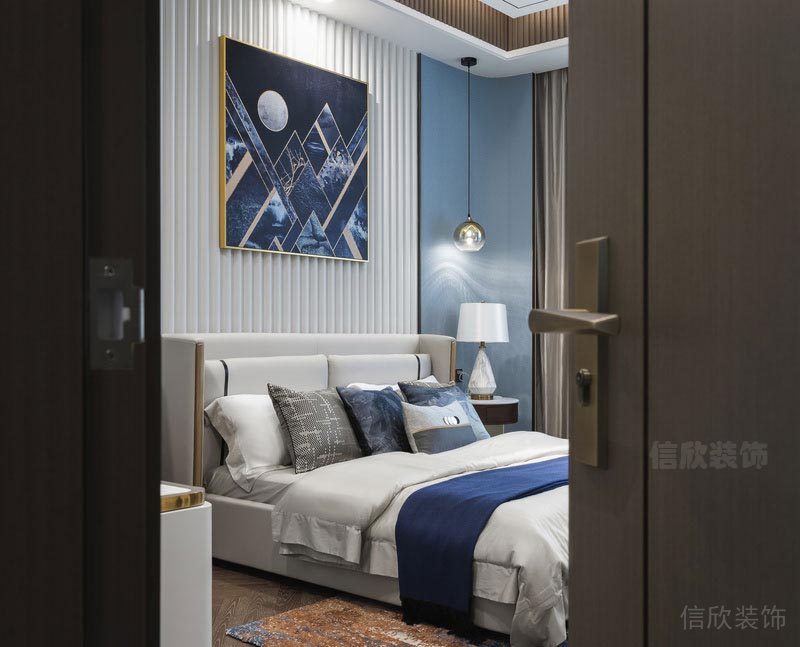 線條簡潔的白色,如天空般閃耀的淺藍,在抽象畫的潮流元素,古典的布藝床,優(yōu)雅的床頭柜的搭配下,讓整間臥室看起來,色彩秀美,五彩繽紛;舉手投足之間,無比閃現(xiàn)出對品質(zhì)生活的無限向往。