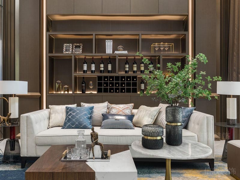 酒柜代替電視背景墻,沙發(fā)不靠墻的設計方式,增加了空間感和實用性,深咖實木的深沉,金屬線條的時尚,讓整個客廳的格調(diào)立馬得到提升,用優(yōu)美的裝飾,裝點出奢華的效果。