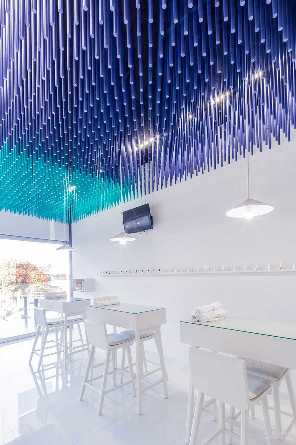 設(shè)計(jì)理念:工作室內(nèi)彩色天花板的設(shè)計(jì)靈感來自于五光十色的美甲產(chǎn)品的選色板,內(nèi)部空間被設(shè)計(jì)成一個(gè)既可以被快速復(fù)制又不失藝術(shù)氛圍的商業(yè)空間。