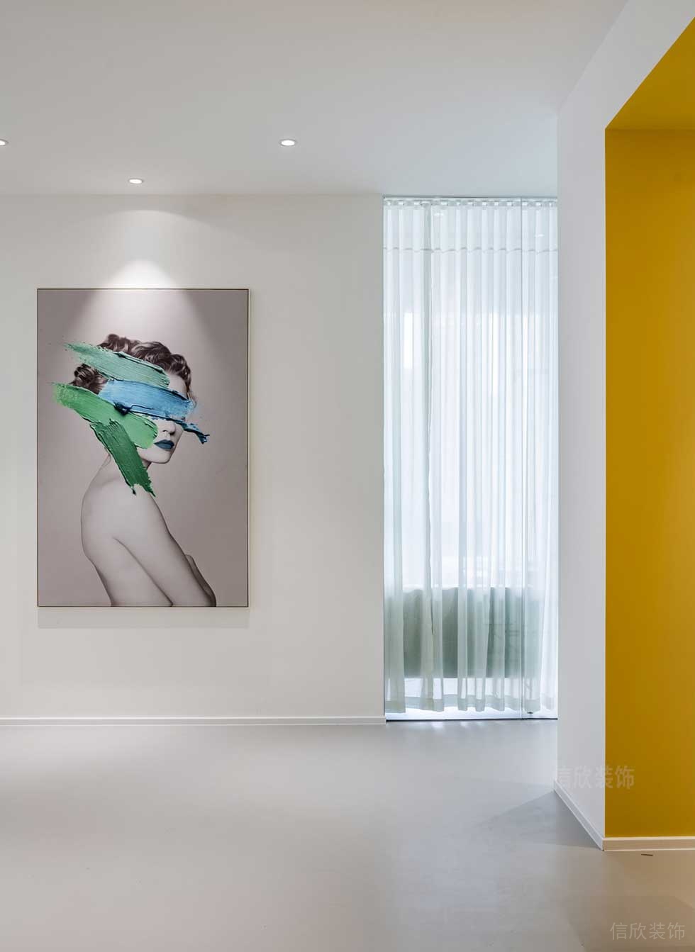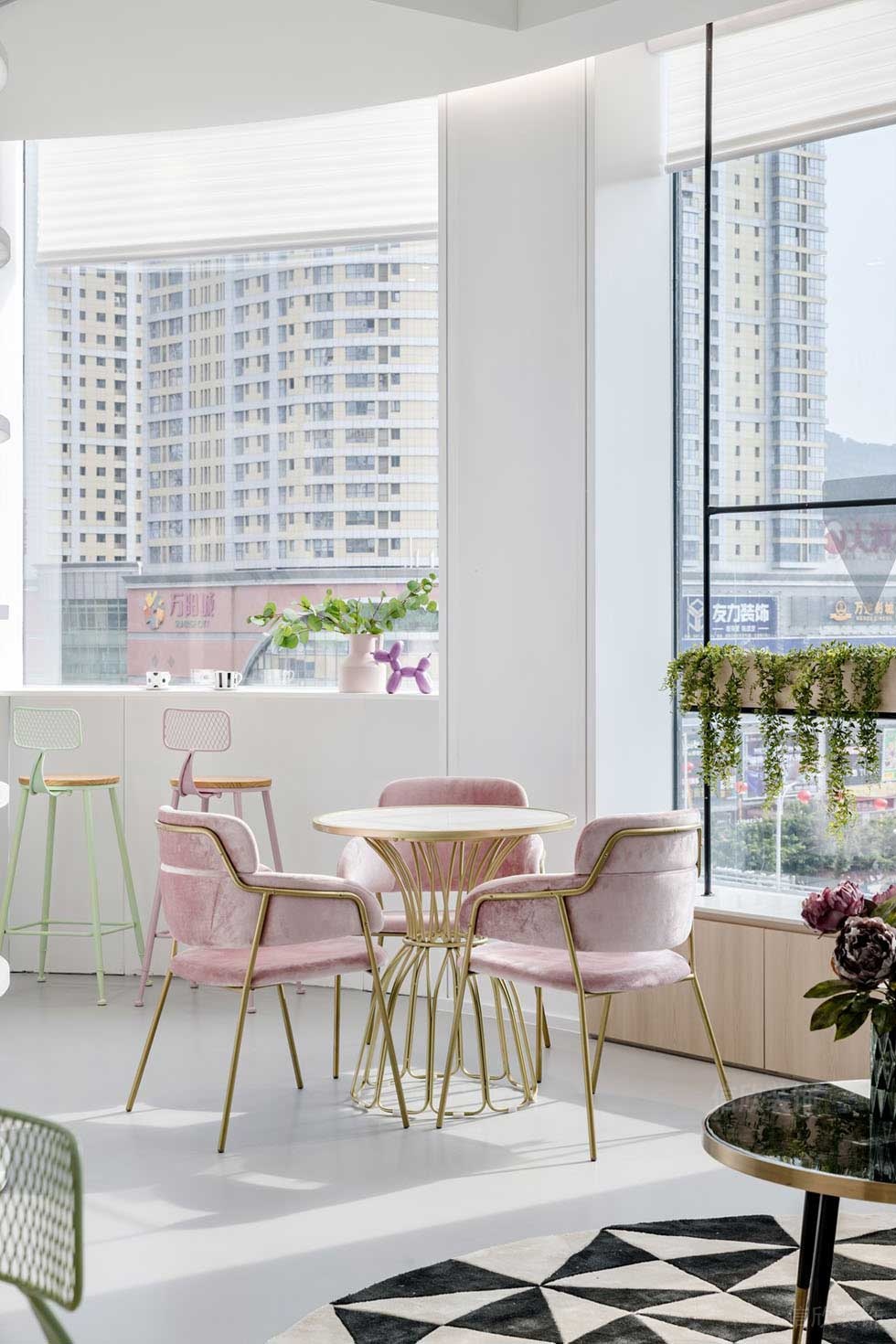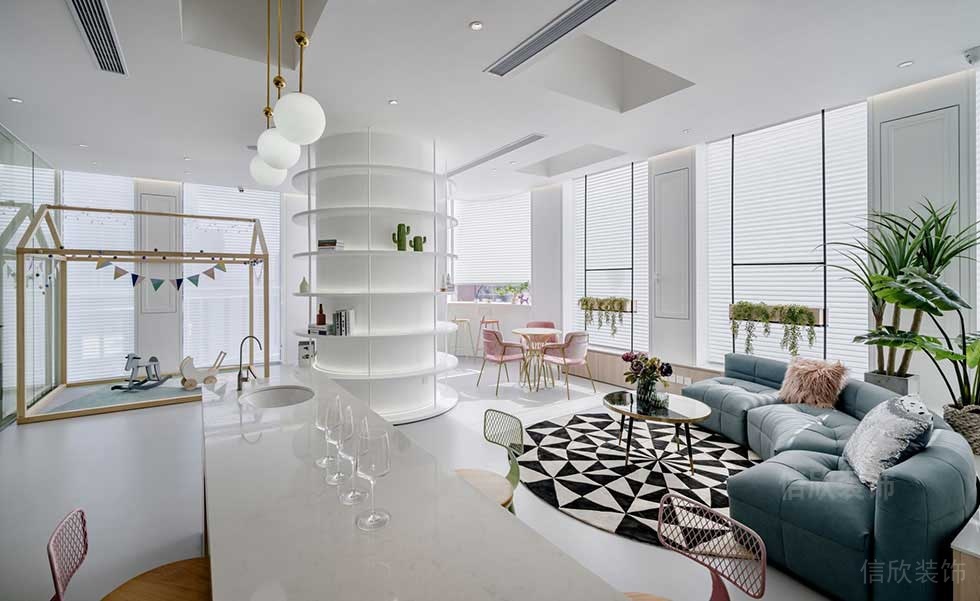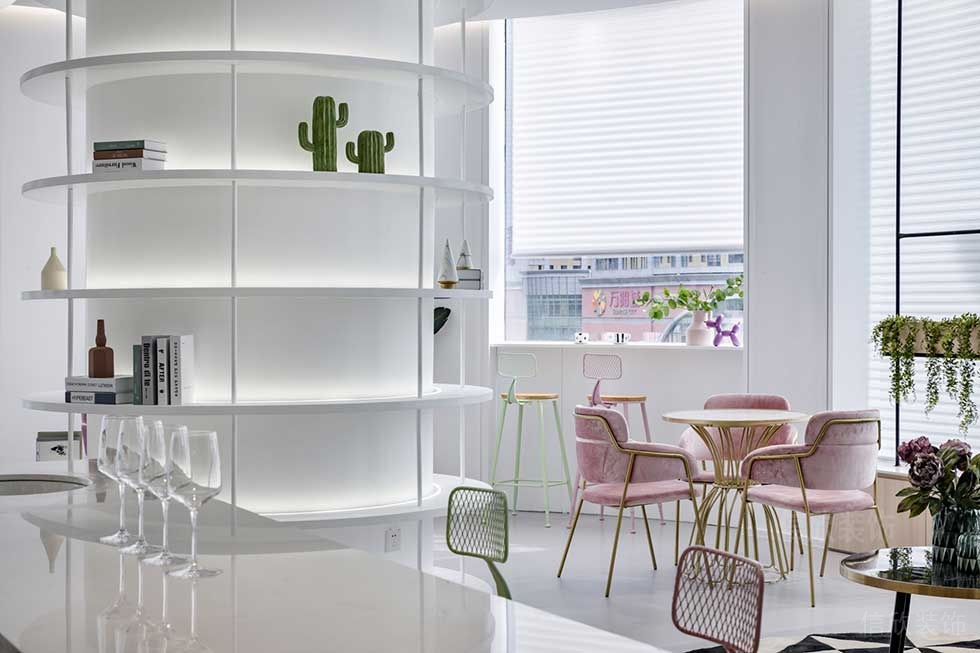 大廳的設計,采用現代主義極簡風的理念,純白色為主體,輕裝修重裝飾的軟裝搭配方式,圓形的柱子作為書架,沿窗邊設置沙發和休閑椅的休息區,打造出美觀實用的高端感覺。