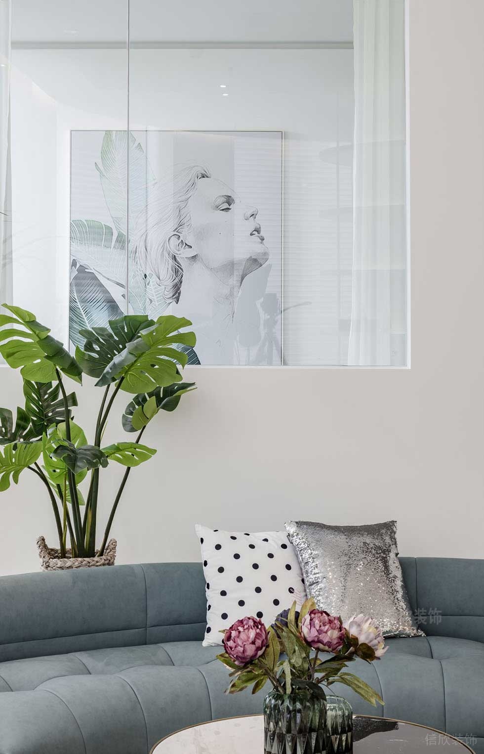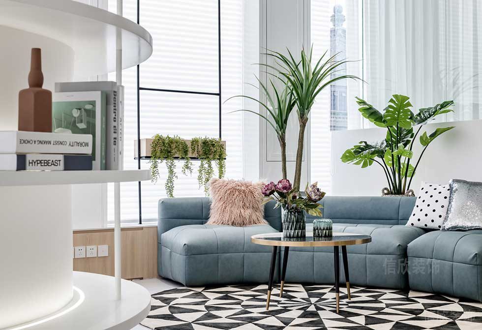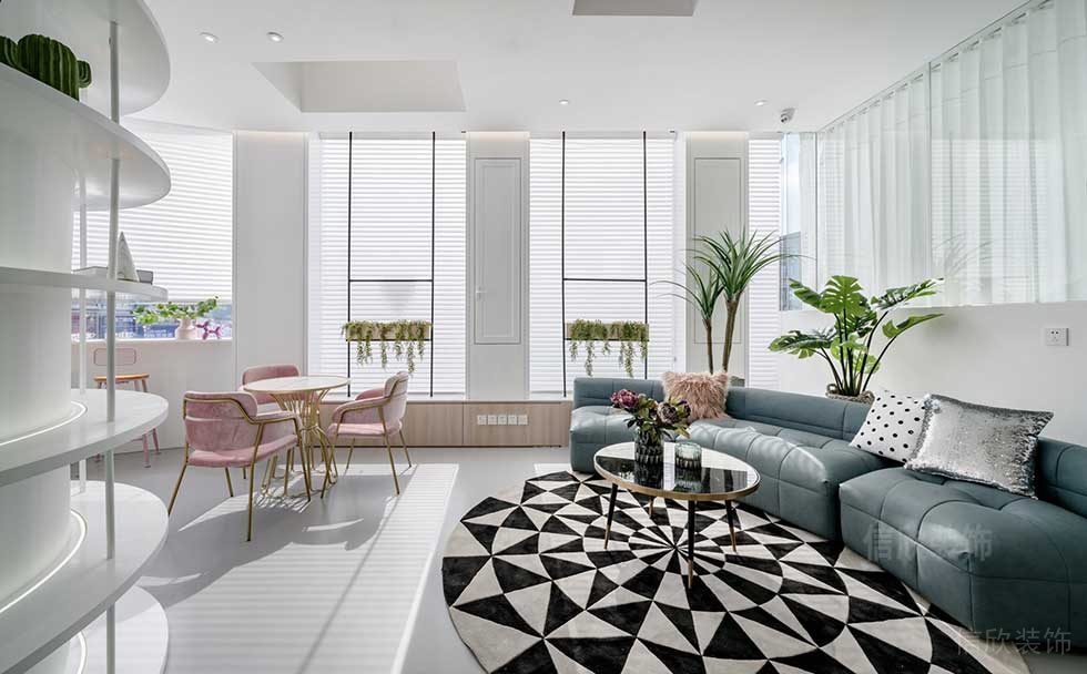 弧形的沙發沿著窗邊倚靠,保證了光線非常高的飽和度和清晰的空氣,黑白色不規則排列的地毯,增添了幾分立體的感覺,在休息和洽談中,多了幾分美感和愜意。