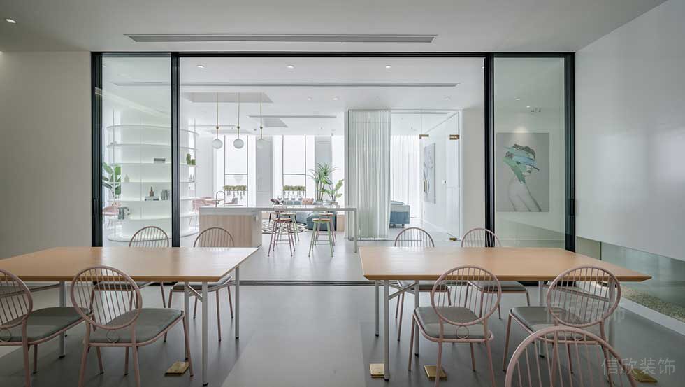 開放式的落地窗設計,即使不開燈也能把光線完美的引入,少了一份拘束,更容易打開心扉,分開式的小會議桌和軟包卡座,代替傳統式的大長桌,打破常規,與時俱進,時尚溫馨。