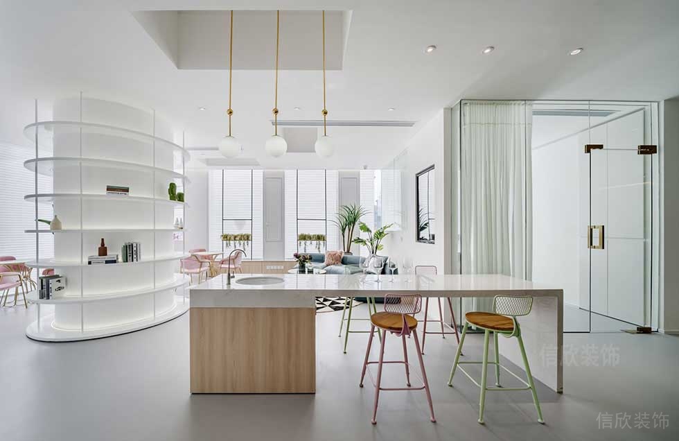 中島臺代替傳統前臺的設計方式,多了一份創意和休閑的感覺,讓客戶一進來似乎感覺是來喝咖啡,朋友聚會一樣,拉進彼此之間的距離,消除隔閡,快速走進客戶的心里。