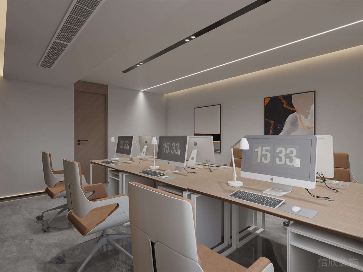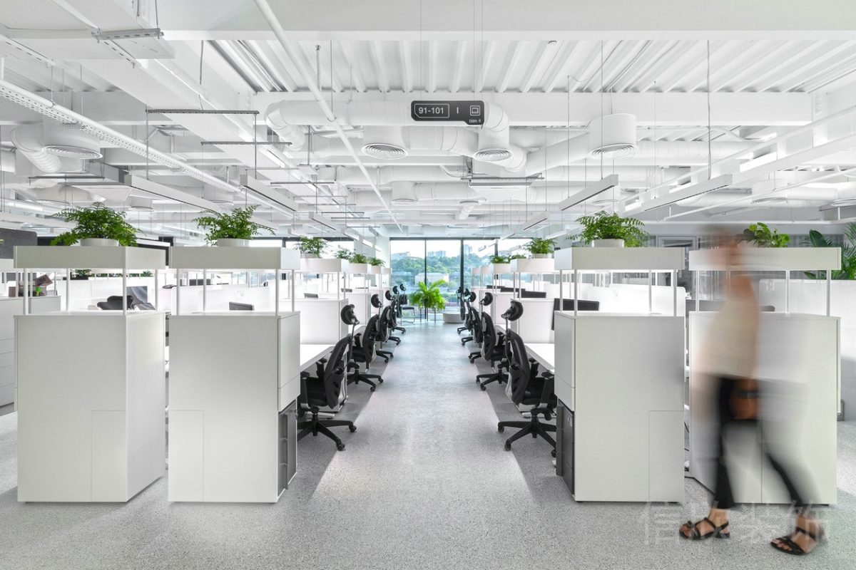 開放辦公區裝修設計天花直接將裸漏的管道噴白處理,統一了空間色調釋放了空間層高。