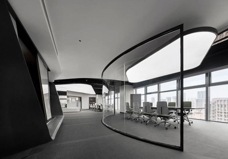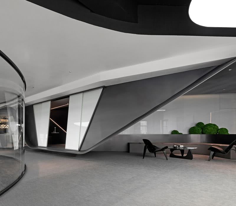 二十世紀(jì)藝術(shù)大師瓦西里·康定斯基在闡述點(diǎn)線面的抽象理論時(shí),曾提出從外在概念與內(nèi)在張力兩個(gè)層面的解構(gòu)方式,因而每一根獨(dú)立的線條或形狀都可以理解為一種元素,設(shè)計(jì)師在運(yùn)用線條語素時(shí),亦是將藝術(shù)張力融入空間之中?!巴涤诩液凸镜娜藗?,是城市間流動(dòng)的力量,塑造城市的同時(shí),成就自我。我們的設(shè)計(jì)以此為題,以流動(dòng)的線型語言,展呈商辦空間的未來性?!?